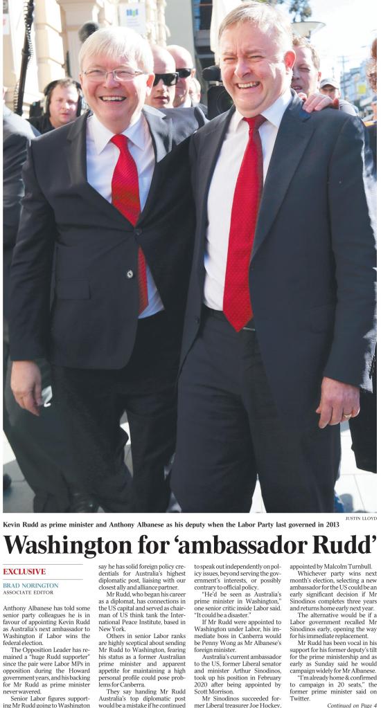 Labor Party sources say suggestions that former PM Kevin Rudd would be appointed to a key ambassadorial post by an Albanese government are true, but a story this week in The Australian (pictured) about the speculation had got a key fact wrong.