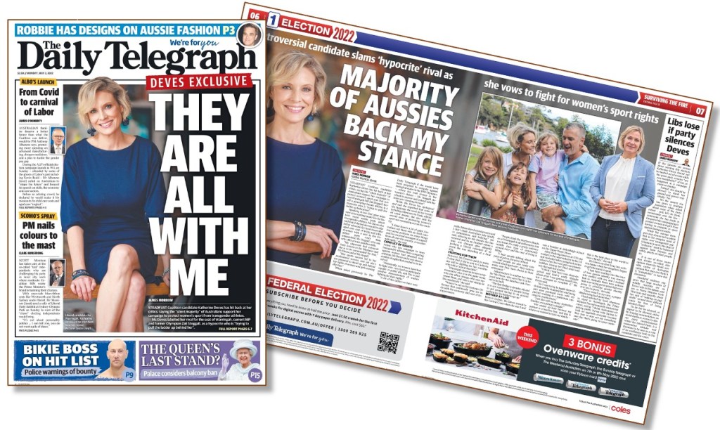 Our researchers live in hope (again, their mistake) that the paper’s federal political editor and Sky News “after dark” commentator James Morrow who wrote the Deves advertisement… sorry, news story … will give Ms Steggall the same free kick, especially since the incumbent MP and ex-Olympian was bagged by Deves in Monday’s story as “a hypocrite” on the issue of trans people in sport.