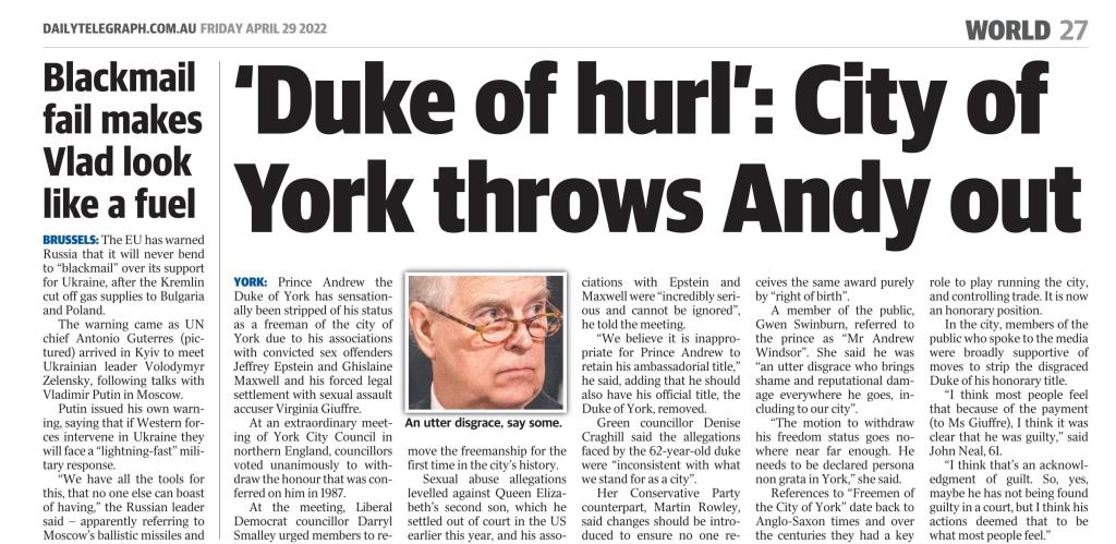 The second example is the headline in a story run in several News Corp Australia outlets about the UK city of York throwing out the Duke of York’s status as freeman of the city. (pictured)