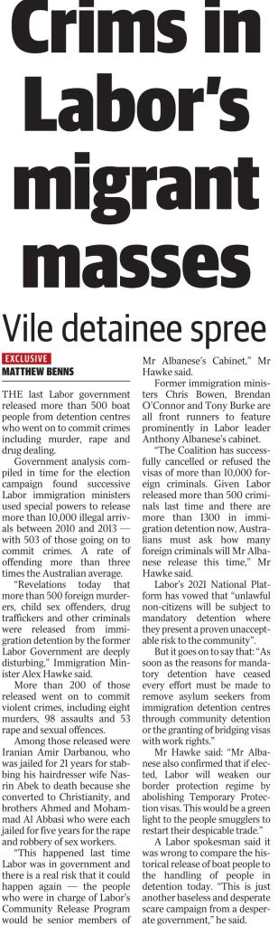 Enter his party’s ad agency which willingly ran in its metro turdbloids during the week a prominent story – an “exclusive” of course – telling readers that the previous Labor government had “released more than 500 boat people from detention centres who went on to commit crimes including murder, rape, and drug dealing”. (pictured)