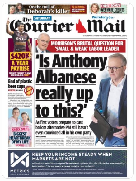 Prime Minister Scott Morrison showed the way yesterday, changing tack – you tend to do that when various policy issues that are supposed to be your strengths fall flat – and calling Anthony Albanese “small and weak” and not up the the job of PM like Smirko is (insert prolonged canned laughter here).