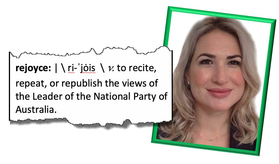 - rejoyce – a verb meaning to recite, repeat, or republish the views of the leader of the National Party of Australia, and