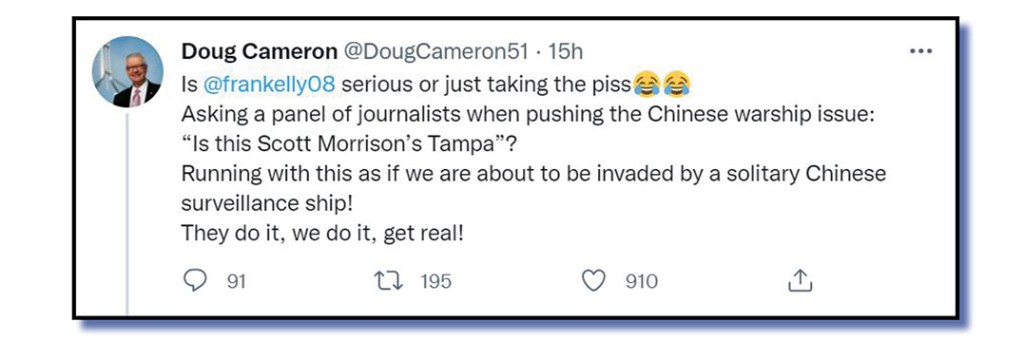 But back to Fran. The ABC veteran has clearly had access to RAN surveillance footage no-one else has seen: hundreds of boat people huddled on the ship’s deck, the perfect opportunity for Scott Morrison to torpedo the ship, metaphorically speaking, while puffing out his chest and declaring with a squeaky voice: “Ah.. ah..ah .. I’ll determine who comes to this country and ah..ah…ah..the manner in which they come!”