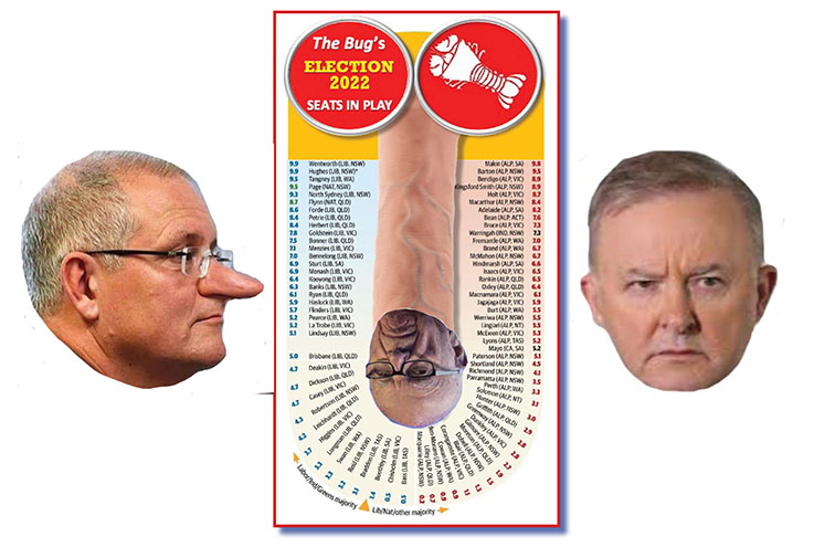 Even the earlier-than-expected release of the second-last Newspoll of the campaign has failed to shift the pendulous dick with a bellend that Bug readers by now have surely realised looks remarkably like a certain nonagenarian, flaccid-arsed, ethically bereft, criminally inclined, money hungry, self-centred New York-based American citizen whose personal and financial interests have forever had fuck-all to do with Australia’s.