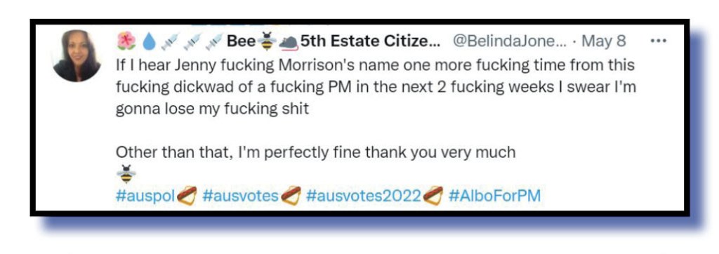 Look, let’s just now run with some general anti-Smoko diatribes seeing election day is nigh, and we think no-one has summed up this six-week-long painful affair better than Bee 5th Estate Citizen @BelindaJone…