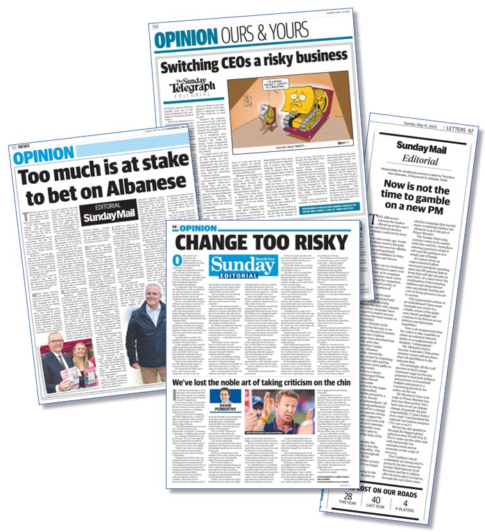 Isn’t it marvellous how all the editors arrived at the same conclusion that Anthony Albanese is a risky choice for PM, that it’s a big gamble to put Labor into office, and that we shouldn’t change PMs at this crucial time in our nation’s history.