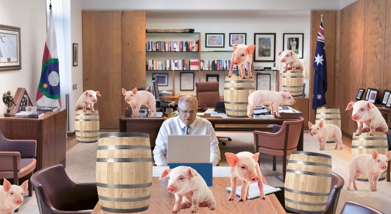 Last night on the ABC’s 7.30 lecture, Morrison gave pork-barreling the big two-thumbs up. He dumped on critics of his most infamous if not most expensive porkbarreling rort from before the 2019 poll – the $100 million sports-rorts scandal.
