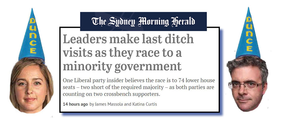 If the LNP musters around 35 percent of the vote tomorrow, they’re stuffed and Massola, the paper’s national affairs editor and Curtis, their Canberra-based political writer, should and probably know that.
