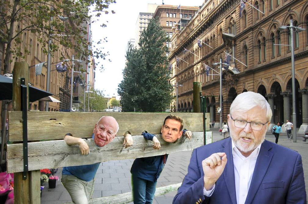 Mr Rudd said Rupert and Lachlan Murdoch would be locked in a pillory and displayed in public places around Australia beginning today in Sydney’s busy Martin Place. (main picture)