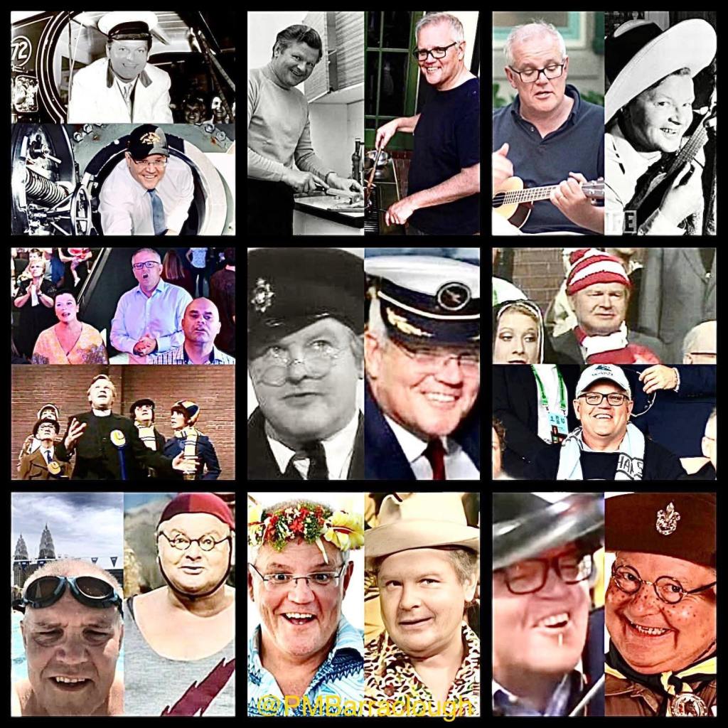 AT TOP: A montage of the amazing Scott Morrison/Benny Hill memes that the wonderful Patricia Barraclough created over the term of the Morrison prime moronship.