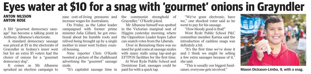 Take the item below in the Sunday Daily Telegraph. True to form it’s a dig at Mr Albanese based on, of all things, the cost of a “democracy sausage” being sold at a polling booth on Saturday in his Sydney seat of Grayndler.
