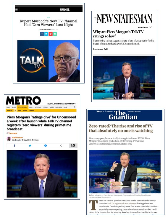 It’s a different story in the UK, where Mr Morgan made his name. Various British media outlets have given plenty of space to following the fate of his new show where apparently Mr Morgan and Mr Murdoch’s TalkTV are both reportedly regularly officially recording zero viewers. (below)