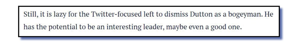Our MGH judges were in total awe of Ms Maley’s effort as she effortlessly threw the words “lazy”, “Twitter-focused” and “left” into just the beginning of a paragraph in a piece devoted to pleading with Australians to give Peter Dutton a fair go, largely through his world view gleaned as a Queensland copper.