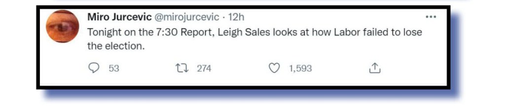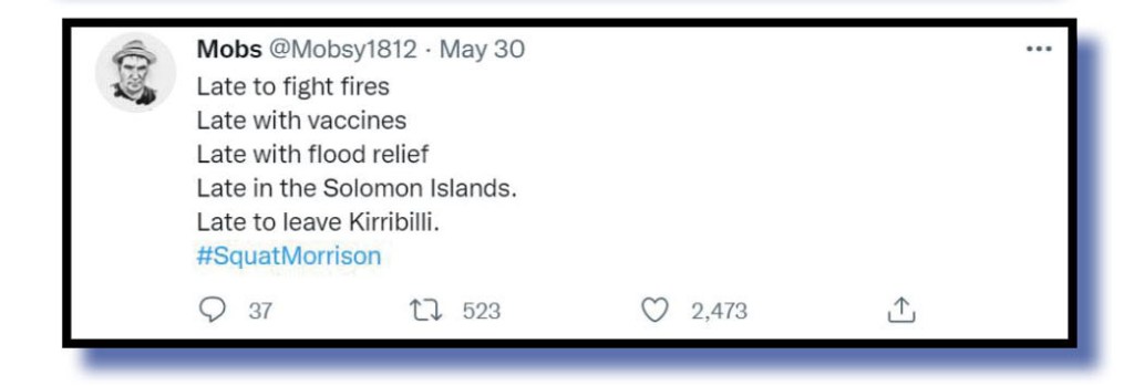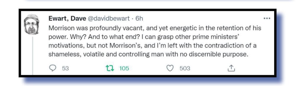 Sadistic as they are, The Bug‘s Tweet of the Week judges couldn’t go past those wonderful two weeks when former PM Scott Morrison and his extended family sooked in Kirribilli House after the 21 May election.