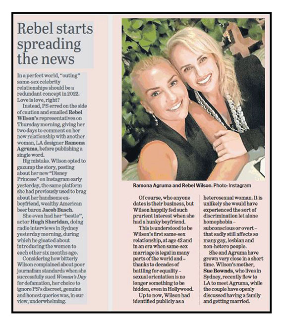 “Instead, PS erred on the side of caution and emailed Rebel Wilson’s representatives on Thursday morning, giving her two days to comment on her new relationship with another woman, LA designer Ramona Agruma, before publishing a single word.