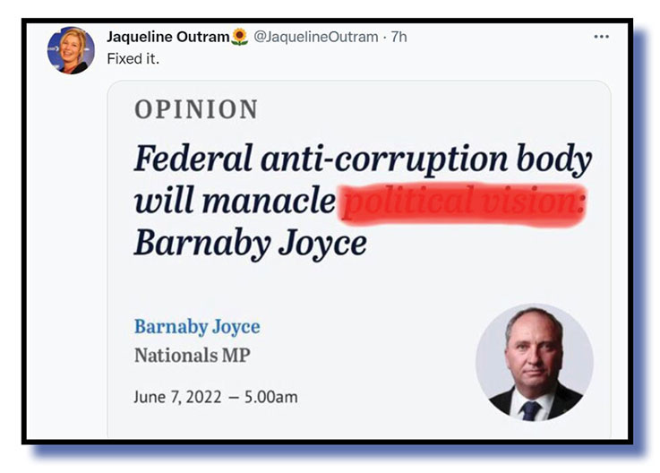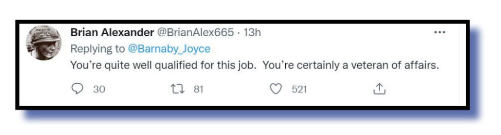 The beaten Deputy Prime Minister, the man who earned more for some scribbled notes on barroom beer coasters than many Australians earn in a decade of hard work, also got roughed up a bit. Brian Alexander @BrianAlex665 and and Jaqueline Outram @JaquelineOutram provided these fine efforts, with Jaqueline showing skills as a sub-editor, fixing a Beetrooter article heading by sensibly removing the unnecessary words “political vision”.