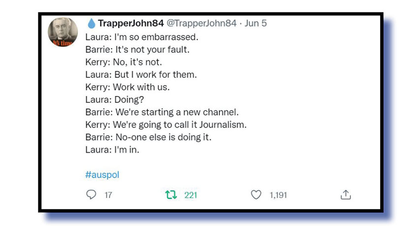 And finally, and rather poignantly, TrapperJohn84 @TrapperJohn84 provided this creative piece centred on dialogue between some former and present ABC scribes.