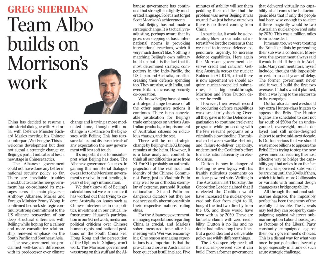 But back to the point we were making. Take international affairs commentator Greg Sheridan who penned a recent column (below) that effectively declared that the recent success the Albanese Government had in re-establishing dialogue with Beijing – in the form of talks between Deputy PM Richard Marles and the Chinese Defence Minister – was due to the work of the Morrison Government.