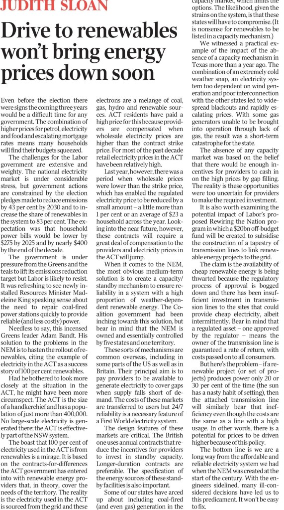 Yes, Judith, that in itself may be correct. But she fails to mention that had the Abbott, Turnbull, and Morrison governments not spent a decade doing nothing but internally argue over this very issue then the nation as a whole might be much, much further down the renewables track and prices may by now have been lower.