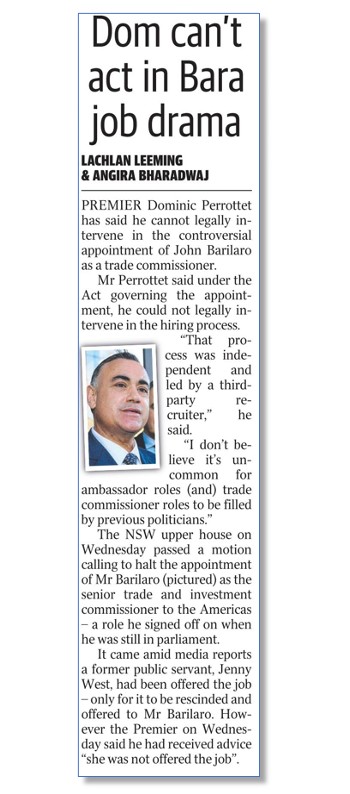 Its second story – appearing after the NSW Parliament’s upper house had formed an inquiry into the Barilaro appointment – quoted the Premier as saying he had not legal basis to intervene in the appointment.