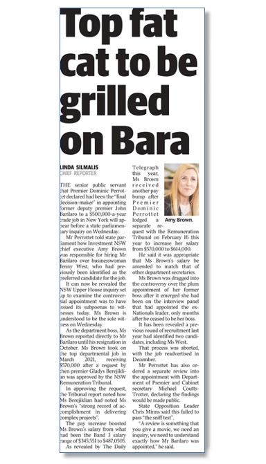 Today in The Sunday Telegraph the author of Saturday’s item, The Daily Telegraph’s chief reporter Linda Silmalis used her political gossip column to say “the crisis enveloping the Perrottet government over its ill-advised appointment of the former Nationals leader continues to escalate”. (below)