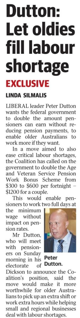 Mr Dutton this week announced his first new policy – a plan to double the amount pensioners could earn before starting to have their benefits reduced by Centrelink. (pictured)