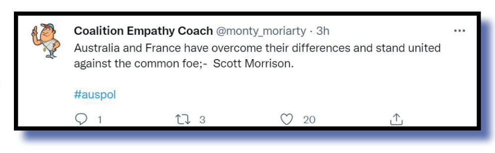 … while both Coalition Empathy Coach @monty_moriarty and Aussie Camel @aussiecamel9745 used the issue to also take a swipe at Smoko Morrison. Remember him? Wasn’t he a celebrity chef or something? On the Australian version of Home Improvements? Showed us how to build dog kennels and cubby houses?