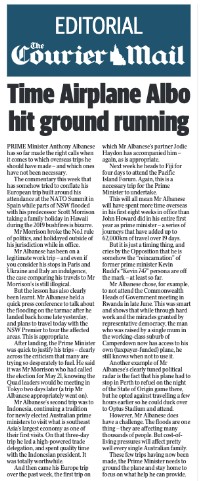 Yet the Courier also thought it appropriate to apply the “Airplane Albo” moniker to the PM in the headline on its editorial, but without the quote marks we’ve used here. (pictured)