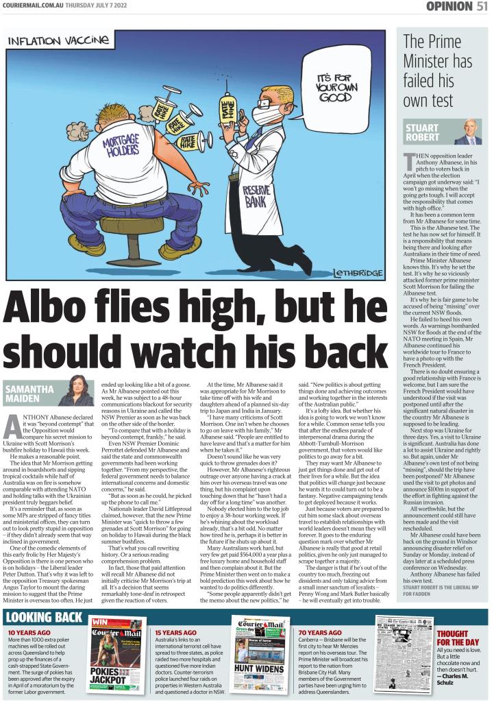 In Brisbane, The Courier-Mail editorial called the criticism of the PM “bizarre” and that he had made the right calls since taking office about which overseas trips to accept and which to reject.