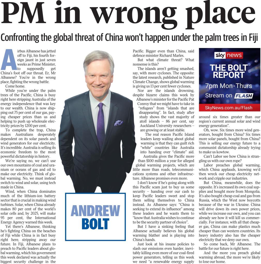 Bolt is not quite as thick as some others in the Murdoch stable so he knows that Albanese’s trip to the Pacific Islands Forum is a necessary one given how badly things blew up in the face of the Morrison Government after years of neglect of the island nations’ interests which allowed China to fill the vacuum in places like the Solomon Islands.