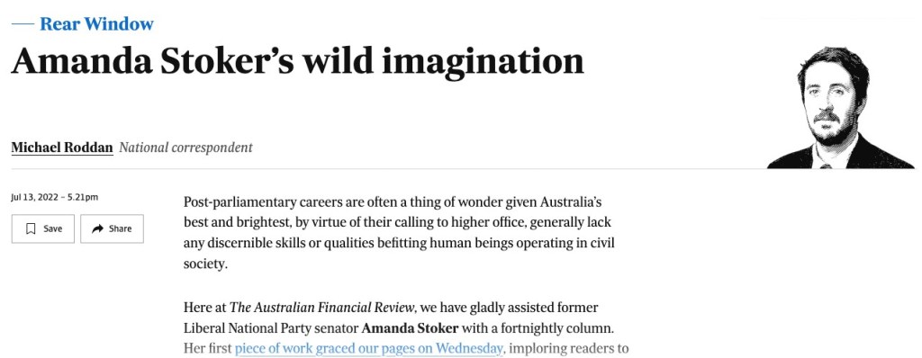 Certainly the business sector may skew right but probably not as much as some the AFR’s columnists, let alone its newest recruit, former Liberal National Party senator for Queensland, Amanda Stoker who lost her Canberra gig at the May federal election.