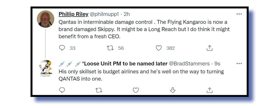 …while Phillip Riley @philmupp1 and Loose Unit PM to be named later @BradsStammers had this exchange where it’s obvious they’d like to grab The Flying Kangaroo by the tail and swing it around so fast Alan Joyce flies off never to be seen again.