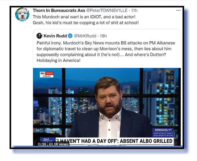 And while we’re on stinging character assassinations, we pay tribute to Thorn in Bureaucrats Ass @PeterTOWNSVILLE who in any other week might possibly have won the top gong with “Murdoch anal wart”!