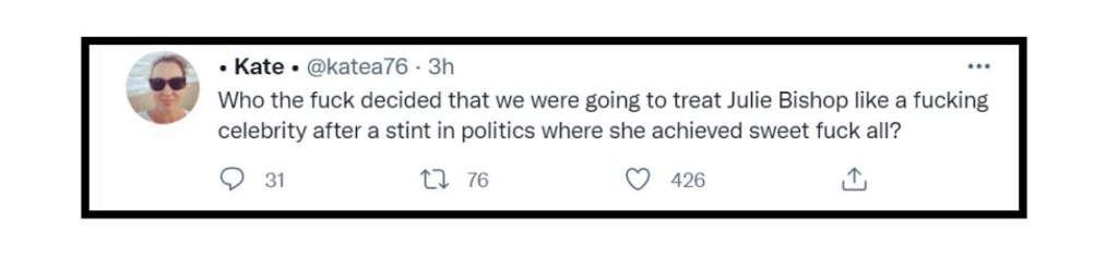 We guess Kate was referring to Julie Bishop’s appearance on The Project and various Channel 9 shows when she tweeted this…