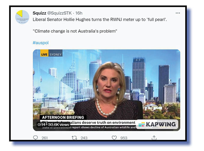 And a former Morrison lightweight who continues to shine a light on her dimness is Hollie Hughes, and Squiz @SquizzSTK didn’t miss her. Turning the RWNJ meter up to ‘full pearl’! Bewdiful.
