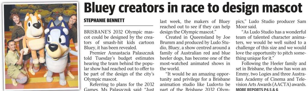BRISBANE: News that the Brisbane-based producers of the globally popular animated TV series Bluey have sought to design a mascot for the 2032 Brisbane Olympic Games (pictured) has prompted other contenders to enter the race.