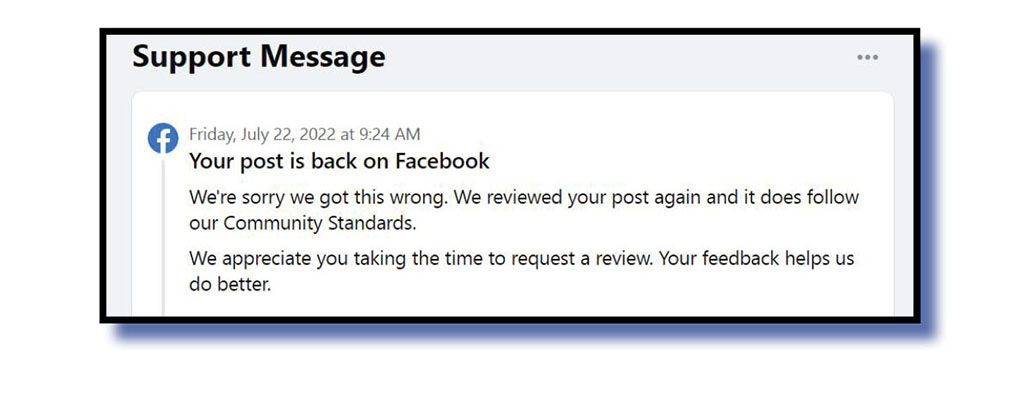And guess what happened? To their credit, Facebook came back in a flash (above) and said they were sorry, they got it wrong, we had followed their community standards and we were back on line. Can anyone guess what I stupidly did next? That’s right. I reposted The Bug story and we were immediately banned again.
