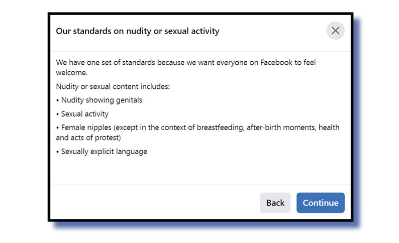 We had contravened Facebook’s strict rules on nudity and sexual activity so into the naughty corner we went.