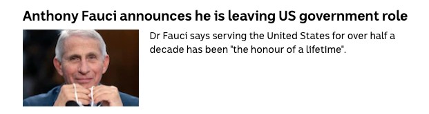 The story noted that Dr Fauci was leaving government service after more than 50 years of working in his chosen field.