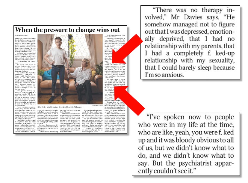 It carried a front-page story spilling to page 8 (below) that canvassed the experience of a 20-something and their experience with the process of transitioning genders.
