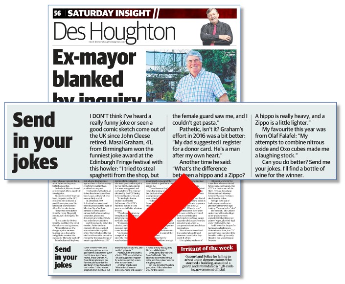 He said the huge traffic snarl had its roots in a call issued to readers by columnist Des Houghton in his regular column in last Saturday’s Courier-Mail asking them to contribute their favourite joke. (below)