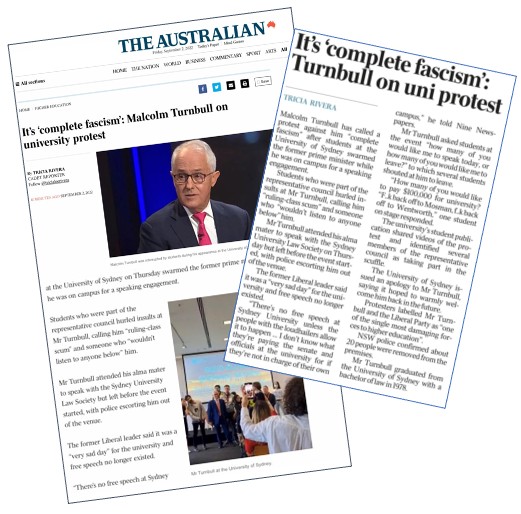 Former PM Malcolm Turnbull was the target of student protesters when he arrived on the University of Sydney campus yesterday to speak to members of its Law Society.
