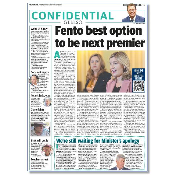 They believe the endorsement given to Ms Fentiman by right-wing News Crap Australia columnist Peter Gleeson in today’s edition of Brisbane turdbloid The Courier-Mail (below) as his pick to succeed Premier Annastacia Palaszczuk means her political career is now all but over.