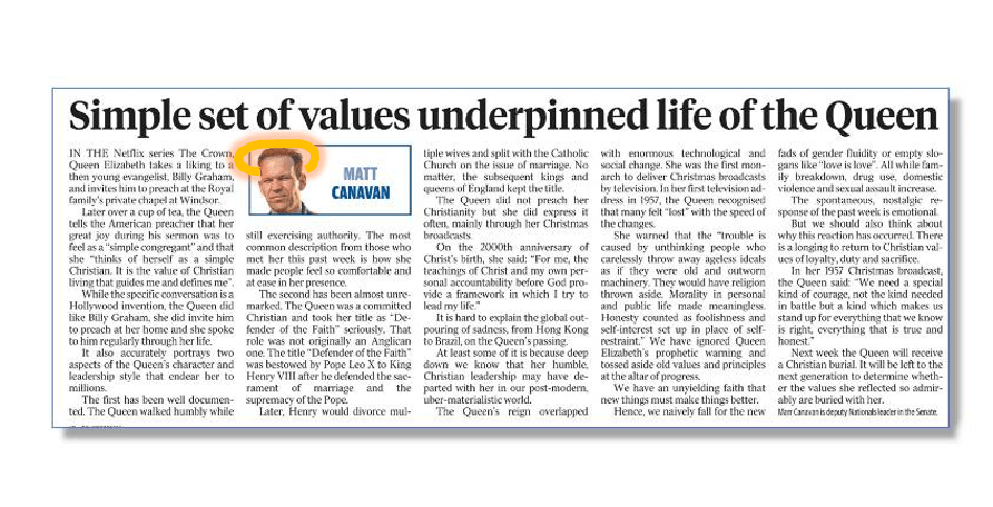 Senator Canavan’s column makes the point that the Queen usually referred to her faith once a year in her Christmas message.