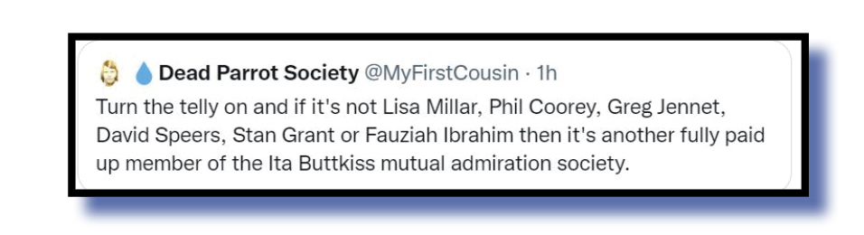 And while we’re on things Aunty, Dead Parrot Society @MyFirstCousin gets a guernsey if for no other reason than releasing “Ita Buttkiss” into the social media airstream.