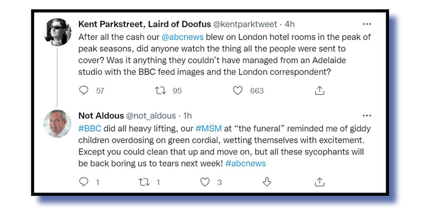Last week’s tweets had plenty to say on the ABC’s coverage of the royal death and funeral so why not keep the rage going? Kent Parkstreet, Laird of Doofus@kentparktweet and Not Aldous @not_aldous had this exchange..
