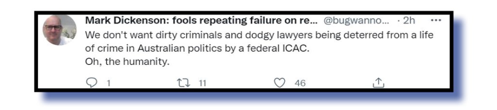 Emma @emma_jayne14 and Mark Dickenson: fools repeating failure…@bugwanno… didn’t miss Senator Hume either when she decided to move on from making an absolute fool of herself over policy matters and came up with some very dodgy reasons why a federal ICAC could be a bad thing.