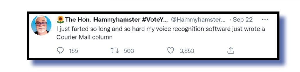 Fourthly, it has a dig at that dreadful shitpaper The Courier-Mail and entrants in this competition should never forget that one of The Bug‘s tweet-of-the-week judges has an almost pathological hatred of that paper for how the cunts in charge treated him while he worked there.
