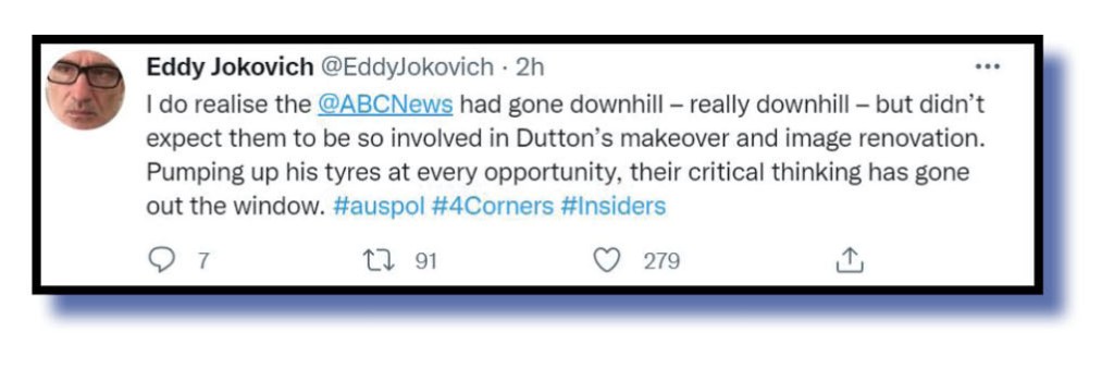 Also taking a dig at Four Corners and the ABC generally was Eddy Jokovich @EddyJokovich …
