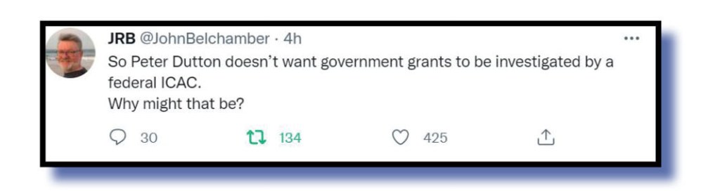 And Geoff made that observation before Sunday night’s Newspoll results showed that recent cross-media attempts to paint Dutton as a nice bloke with loads of potential and friends had failed miserably. A point made perfectly by Revardin @revardin who, to be fair, must be wondering why he, she or it didn’t at least share the blue winner’s sash with Bee.